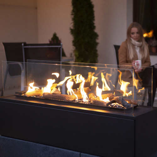 PATIO je navrženo s maximálním důrazem na vaši bezpečnost. Je poháněno z tlakové plynové láhve, která je bezpečně umístěna v robustní ocelové základně ošetřené odolnou práškovou barvou proti poškození. Plamen je chráněn tvrzeným sklem o tloušťce 4 mm. Spodní komora s lahví je zabezpečena zámkem, který brání neoprávněnému přístupu.
